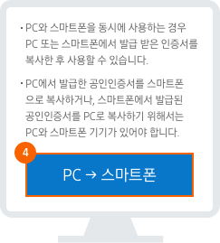 PC와 스마트폰을 동시에 사용하는 경우 PC 또는 스마트폰에서 발급받은 인증서를 복사한 후 사용할 수 있습니다.