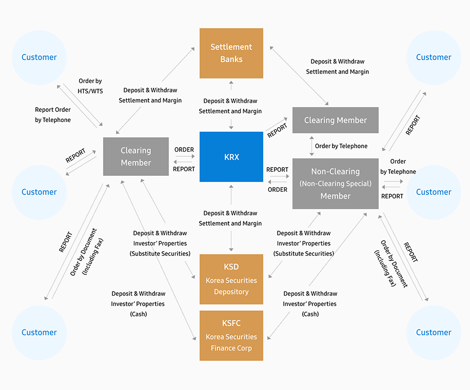 investors’ money and monitors investors’ properties for them. A foreign investor should designate foreign exchange banks through a foreign currency exchange agreement to execute his foreign exchange transactions and transfers. Most foreign exchange banks also do custodian bank and standing proxy operations. A foreign investor should designate securities and futures companies to trade futures and options traded on KRX.